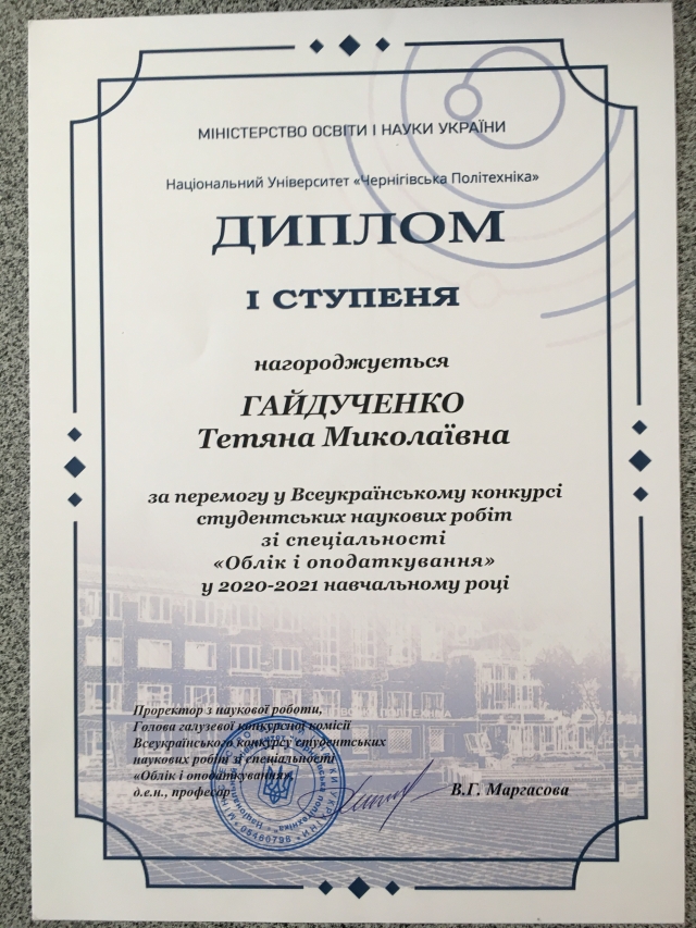 Марію Ніколенко (студентку 4 курсу ОС «Бакалавр» спеціальності 071 «Облік і оподаткування» освітньо-професійної програми ОПП «Облік і аудит») нагороджено дипломом II ступеня за підготовлену студентську наукову роботу на тему на тему: «Адаптація організації обліку розрахунків з оплати праці до умов пандемії», науковий керівник – професор Любов Гуцаленко.