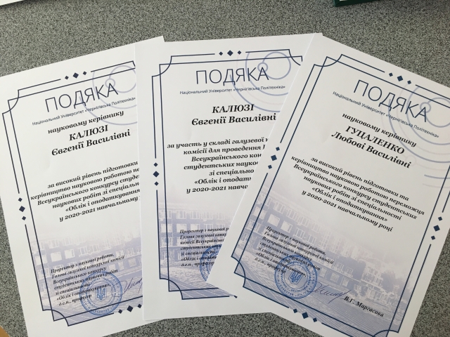 Наукові керівники (Євгенія Калюга і Любов Гуцаленко) отримали Подяки від проректора з наукової роботи, Голови Галузевої конкурсної комісії Всеукраїнського конкурсу студентських наукових робіт зі спеціальності «Облік і оподаткування» професора Вікторії Маргасової.
