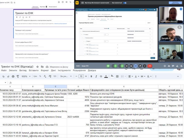 Щоб ефективно організувати його роботу колегам було запропоновано зареєструватися, сформулювати свої питання і обрати час для зустрічі. Оскільки тиждень видався завантаженим (інтенсивні обговорення ОП «Право»), ми все таки зустрілися після робочого дня і пройшлися по питаннях анкети. А питань було чимало: нові вимоги для атестації ЕНК, типові помилки при наповненні ресусрів, нововведення 2024 року, особливості інструментів "повторне використання курсу", "завершення курсу", "відзнаки", формування журналу оцінок, вбудовування презентацій до «Книги» з лекцією, журнал оцінок з дисципліни, що викладається два семестри, вимоги до самостійної роботи, а саме обсяг завдань на 1 модуль, експорт/імпорт питань до банку питань з документу Word або просто дізнатися щось нове, здобути навички, які буду використовувати у своїй роботі.