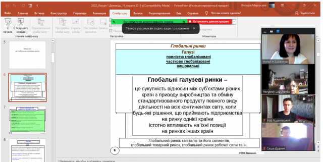 НПП кафедри глобальної економіки спільно із студентами-магістрами активно продовжують на лекціях обговорення базових засад функціонування механізму дії глобальних галузевих ринків. Так, Наталія Вдовенко, д.е.н., професор, завідувач кафедри, на лекційних заняттях постійно орієнтує студентів на питання важливості подальшої практичної діяльності майбутніх випускників, спонукає до розуміння чинників формування глобальних галузевих ринків, щоб у майбутньому наші юнаки та дівчата, оволодівши набутими знаннями, стали конкурентоспроможними на глобальному ринку праці.