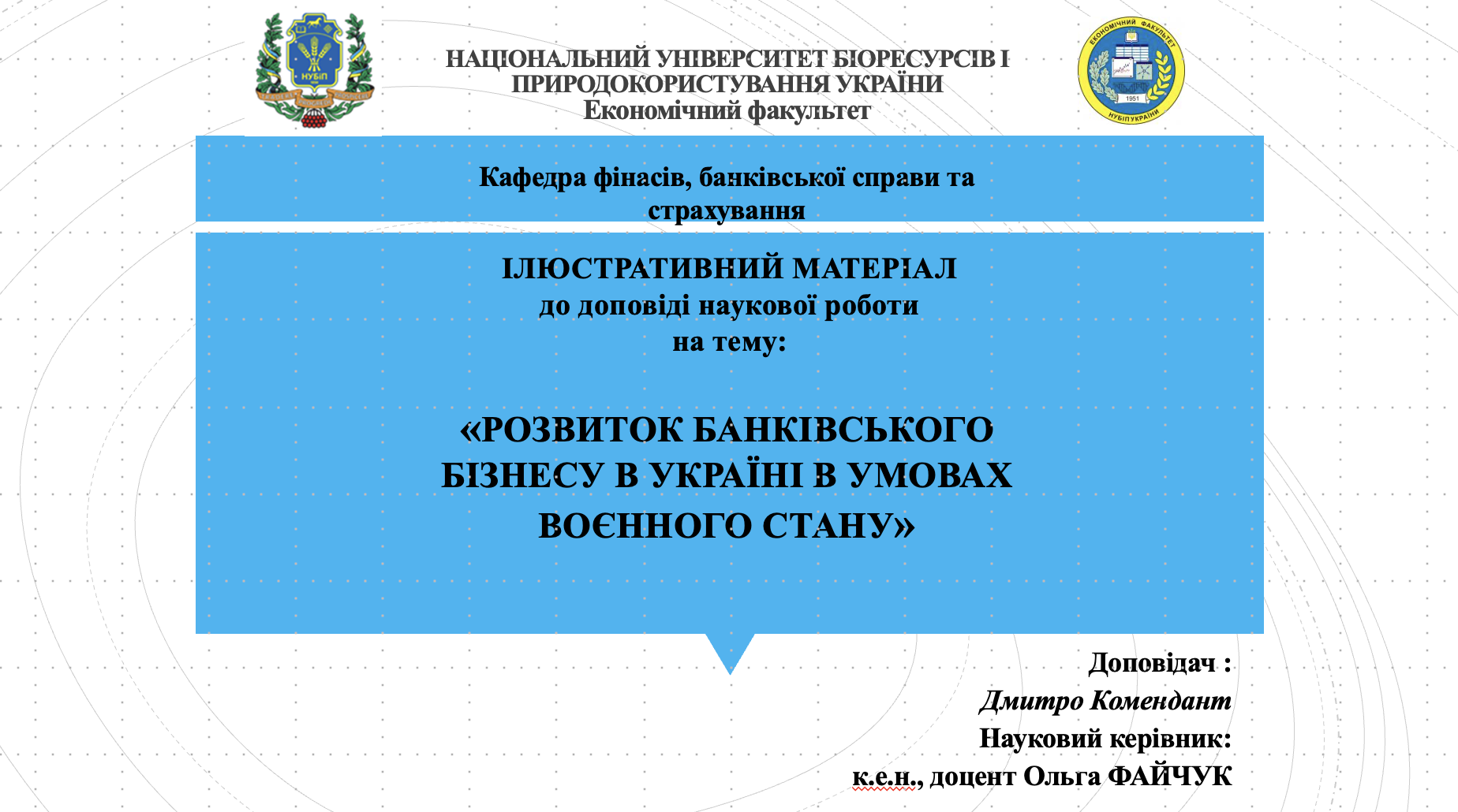 Дослідження Дмитра КОМЕНДАНТА, студента 3 курсу, 5 групи, ФБСС, «Розвиток банківського бізнесу в Україні в умовах воєнного стану» (науковий керівник: к.е.н., доцент Ольга ФАЙЧУК) присвячене аналізу функціонування банківської системи в умовах воєнних викликів. У роботі розглянуто трансформацію банківських послуг, цифровізацію, зміну підходів до управління ризиками та адаптацію фінансових установ до нових економічних реалій. Окрему увагу приділено перспективам відновлення та розвитку банківського сектору.
