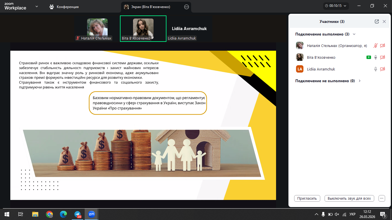 У роботі Віти В'ЯЗОВЧЕНКО, магістра 1 року навчання, спеціальність ФБСС, «Трансформація страхового ринку України в умовах воєнного стану» (науковий керівник: к.е.н., доцент Ольга ФАЙЧУК) здійснено комплексний аналіз змін у функціонуванні страхового ринку. Досліджено вплив воєнного стану на структуру страхових продуктів, попит на страхові послуги та фінансову стійкість страхових компаній. Авторка також окреслила ключові напрями адаптації ринку до нових умов.