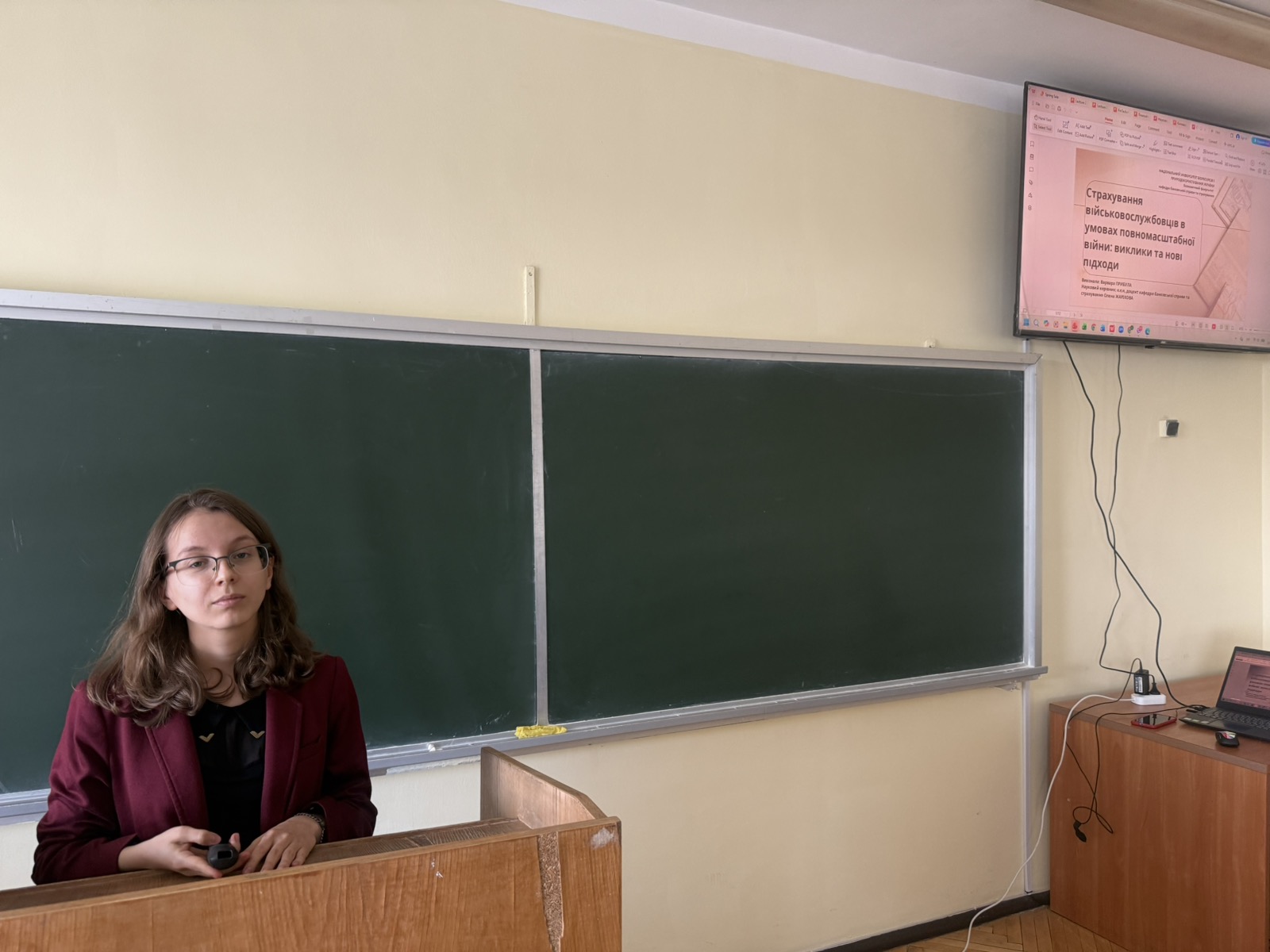 Дослідження Варвари ПРИБУЛИ, студентки 3 курсу, групи ЕКК, «Страхування військовослужбовців в умовах повномасштабної війни: виклики та нові підходи» (науковий керівник: к.е.н., доцент Олена ЖАРІКОВА) присвячене аналізу специфіки страхового захисту військових. У роботі визначено основні проблеми чинної системи страхування, розглянуто ризики, з якими стикаються військовослужбовці, та запропоновано підходи до вдосконалення страхових механізмів у воєнний період.