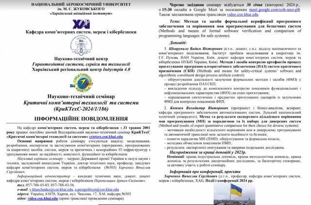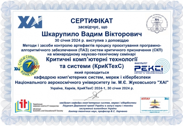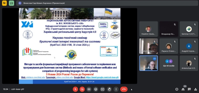 У співпраці з колегами із кафедри комп’ютерних систем, мереж та кібербезпеки Національного аерокосмічного університету ім. М.Є. Жуковського "Харківський авіаційний інститут" – у режимі онлайн на Науково-технічному семінарі «Критичні комп’ютерні технології та системи» (КриКТехС-2024/1/186) виступив із науковою доповіддю к.т.н., доцент, доцент кафедри комп’ютерних систем, мереж та кібербезпеки Вадим ШКАРУПИЛО.