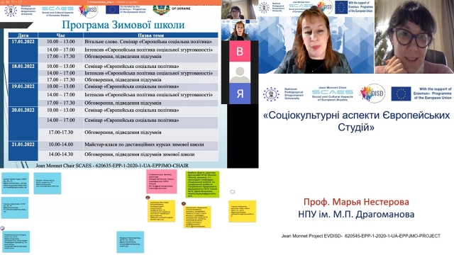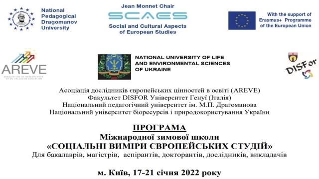 17 січня 2022 р. розпочалася Міжнародна зимова школа «СОЦІАЛЬНІ ВИМІРИ ЄВРОПЕЙСЬКИХ СТУДІЙ» в рамках імплементації проєкту Кафедра Жана Монне «Соціальні та культурні аспекти Європейських Студій» (SCAES), в якій викладачі економічного факультету НУБіП України приймають активну участь. Основною ідеєю проекту є сприяння європейській інтеграції освіти України та розбудова дієвої професійної мережі освітян в Україні та за кордоном. Розпочалась робота Зимової школи з вітального слова координаторів проєкту: доктора філософських наук, професора кафедри менеджменту та інноваційних технологій соціокультурної діяльності Національного педагогічного університету імені М.П. Драгоманова, професора кафедри Жана Моне SCAES, академічного координатора проекту Жана Моне EVDISD Марьї Нестерової та європейського експерту проєкту, професора Університету Генуї, Діани Спулбер.