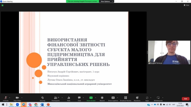 Андрій ПЯТАЧУК, (здобувач ОС «Магістр», Миколаївський національний аграрний університет), з доповіддю на тему «Використання фінансової звітності суб’єкта малого підприємництва для прийняття управлінських рішень», керівник – к.е.н., ст. викладач Лугова О.І.