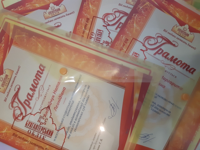 Оргкомітетом студентської науково-практичної конференції проведено нагородження учасників враховуючи змістовність доповіді та актуальність тематики молодих фахівців, відзначивши їх сертифікатами та почесними грамотами від ТОВ «Редакція Газети «Все про бухгалтерський облік» та подарунками.