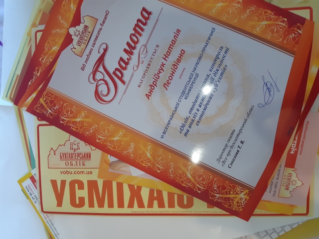 Доречно відмітити, що студенти спеціальності «Облік та оподаткування» НУБіП Укрваїни (Т. Гайдученко, К. Нестерова, Н. Андрійчук, Ю.Дуда, І. Кондаревич) гідно представили свій Університет науковими здобутками, які презентували на ХІХ Всеукраїнській студентській конференції «Розвиток системи обліку, аналізу та аудиту: теорія, методологія, організація» у Національній академії статистики, обліку та аудиту, м. Київ та IV Міжнародній науково-практичній конференції «Проблеми та перспективи сучасного розвитку фінансів, обліку та банківської діяльності» в Університеті імені Альфреда Нобеля, м. Дніпро.