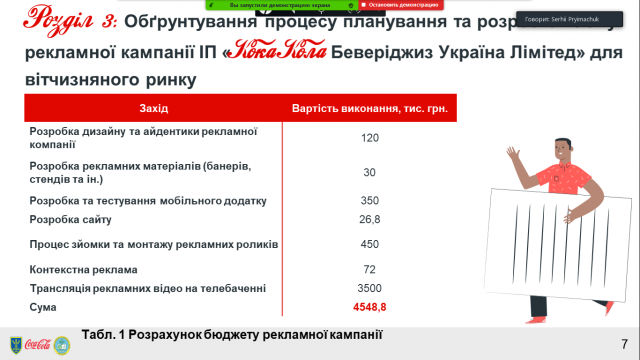 Магістрами розроблено товари-новинки для досліджуваних підприємств, контент-плани з просування продукції в мережі інтернет, бюджет маркетингових заходів, креативні стратегії з просування продовольчої продукції та інші маркетингові елементи. Розробки пропозиції магістрів-маркетологів викликали активну дискусію та питання як від студентів, так і від викладачів кафедри.