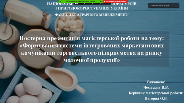 Під головуванням завідувача кафедри Руслана Івановича студенти магістратури представили свої наукові досягнення у сфері маркетингу та реклами. Оприлюдені результати магістерських досліджень є вражаючими. Магістрами проаналізовано надзвичайно актуальні питання у сфері розвитку маркетингу на переробних та сільськогосподарських підприємствах, а саме: особливості формування та розвитку товарного асортименту, використання маркетингових комунікацій, розвитку брендингу та креативних стратегій, особливості розвитку інтернет-маркетингу на вітчизняних підприємствах, дослідження поведінки споживачів. Магістрами також були проаналізовано питання, які пов’язані із функціонуванням та розвитком товарних ринків в Україні.