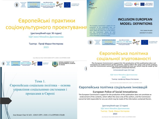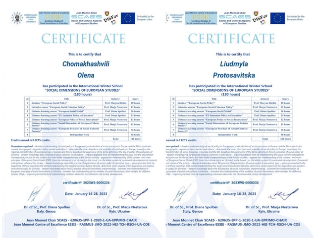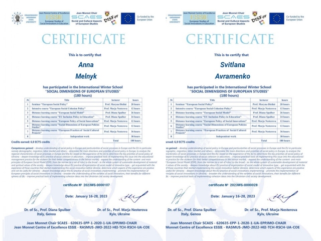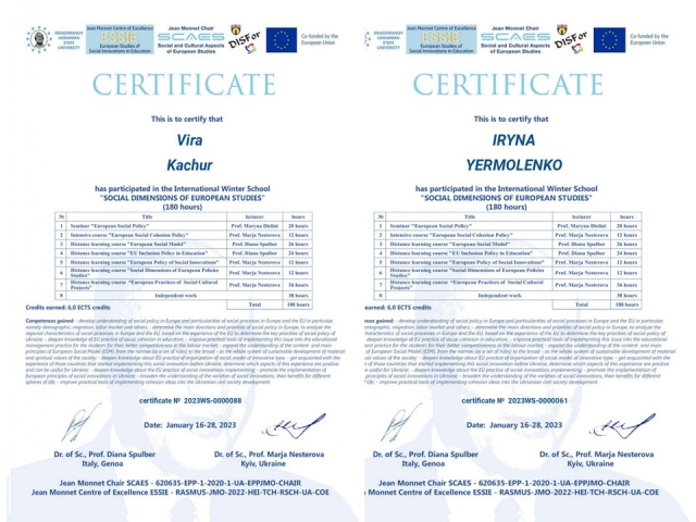 Впродовж 16-28 січня 2023 року Віра Качур, Ірина Єрмоленко, Людмила Протосавіцька, Олена Чомахашвілі, Світлана Авраменко, Анна Мельник студіювали 7 модульних курсів - «Європейська соціальна політика» (20 год., тьютор Марина Дєліні), інтенсив «Європейська політика соціальної згуртованості» (12 год., тьютор Марья Нестерова), дистанційний курс «Європейська соціальна модель» (26 год., тьютор Діана Спулбер), дистанційний курс «Інклюзивна політика ЄС в освіті» (24 год., тьютор Діана Спулбер), дистанційний курс «Європейська політика соціальних інновацій» (12 год., тьютор Марья Нестерова), дистанційний курс «Соціальні виміри європейських політик» (12 год., тьютор Марья Нестерова), дистанційний курс «Європейські практики соціокультурного проєктування» (36 год., тьютор Марья Нестерова).