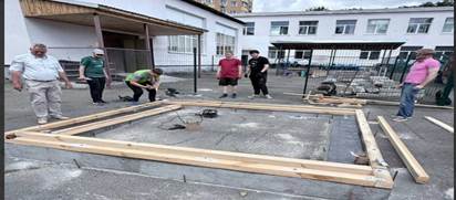 Після набору міцності бетонної основи укладено гідроізоляційний шар та встановлено дерев’яний брус для подальшого монтажу дерев’яного каркасу.