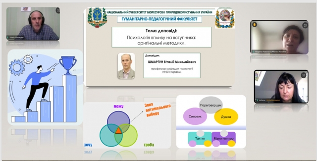 Професор кафедри психології Віталій Шмаргун висловив думку щодо психології впливу на вступника та оригінальні методики роботи з ним. Головний месендж спікера – важливість формування в абітурієнта потреби вчитися та допомоги в задоволенні такої потреби з боку викладача.