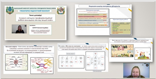 Керівник центру профорієнтаційної роботи на факультеті, Наталія Шакун розкрила питання сучасних методів профорієнтаційної роботи, поділилася інноваційними методиками та практичними порадами для успішної профорієнтації.