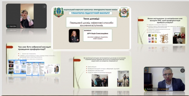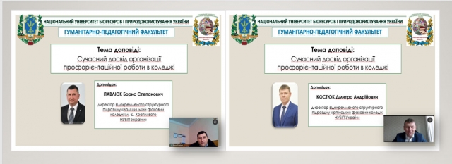 Сучасний досвідом організації профорієнтаційної роботи в закладі освіти поділилися для учасників заходу директор відокремленого структурного підрозділу «Ірпінський фаховий коледж НУБіП України» Дмитро Костюк і директор відокремленого структурного підрозділу «Заліщицький фаховий коледж ім. Є. Храпливого НУБіП України» Борис Павлюк. Спікери наголосили на важливості систематичного проведення профорієнтаційної роботи, починаючи з 2 вересня і до моменту вступу абітурієнта. Різноманіття заходів профорієнтації, робота з опорними школами, реклама в медіа та нативна профорієнтаційна робота по залученню вступника = отриманню вмотивованого студента.