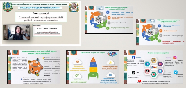 Доцент кафедри філософії та міжнародної комунікації Олена Лаута звернула увагу присутніх на можливості та переваги соціальних мереж в профорієнтаційній роботі: необмежені можливості, широке охоплення цільової аудиторії, публікація відповідно до цільових груп, комплексна взаємодія всіх соцмереж.