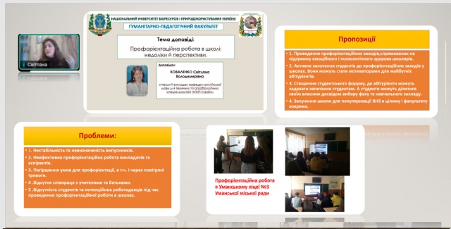 Старший викладач кафедри англійської мови для технічних та агробіологічних спеціальностей Світлана Коваленко, яка має понад 12 років стажу роботи заступником директора школи з виховної роботи, зосередилася в своїй доповіді на недоліках й перспективах профорієнтаційної роботи в школі.