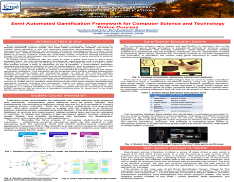 На постерній секції конференції Володимир Анатолійович представив дослідження “Semi-Automated Gamification Framework for Computer Science and Technology Online Courses”. Доповідач відмітив, що нові технології, такі як VR, AR та AI, разом із величезною популярністю відеоігор і цифрових розваг відкривають нові можливості для викладачів і розробників онлайн-курсів, а також різноманітних методів гейміфікації. Фреймворк Gamification — це напівавтоматизована система, яка має бути підключена до існуючої освітньої онлайн-платформи.