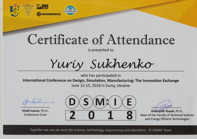 Завідувач кафедри процесів і обладнання переробки продукції АПК, доктор технічних наук, професор Сухенко Юрій Григорович прийняв участь у Міжнародній конференції «design, Simulation, Manufacturing: The Innovation Exchange», яка відбулася 12-15 червня у місті Суми.