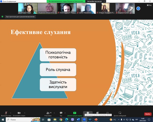 Відкрита лекція доцента кафедри психології Людмили Омельченко з дисципліни «Психологія спілкування» на тему «Чинники ефективного спілкування» для студентів 2 курсу спеціальності 053 «Психологія» відзначалася науковістю, систематизованістю викладу, єдністю форми та змісту, емоційністю. Виклад теми мав проблемний характер та передбачав діалог зі студентами, наукові факти ілюструвалися яскравими прикладами з їхнього комунікативного досвіду, професійної практичної діяльності, ситуацій спілкування відомих людей, науковців, а водночас був ґрунтовним і доступним для здобувачів.