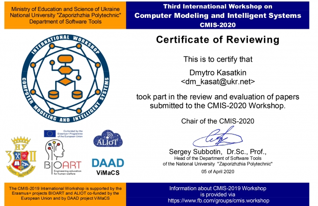 Окрім безпосередньої підготовки наукової доповіді завідувач кафедри д.т.н., проф. Лахно В.А. та к.п.н., доц. Касаткін Д.Ю. приймали участь у рецензуванні декількох робіт поданих у збірник CMIS-2020, який буде проіндексовано у наукометричній базі Скопус.
