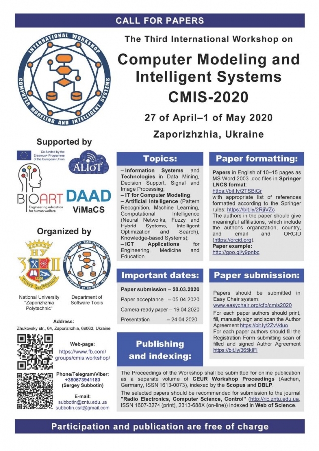 В квітні місяці завідувач кафедри д.т.н., проф. Лахно В.А., д.ф.-м.т.н., проф. Малюков В.П., к.п.н., доц. Касаткін Д.Ю., к.п.н., доц. Блозва А.І. підготували науковий доклад на третій міжнародний workshop CMIS-2020, який пройде 27 квітня – 1 травня в Запоріжжі. Workshop CMIS-2020 пройде в режимі онлайн доповідей із використанням технічних засобів. Тема докладу "Model for Supporting Decisions of a Group of a Smart City Project Investors, Taking into Consideration Multifactoriality and Turnover".