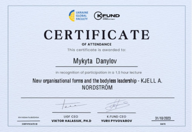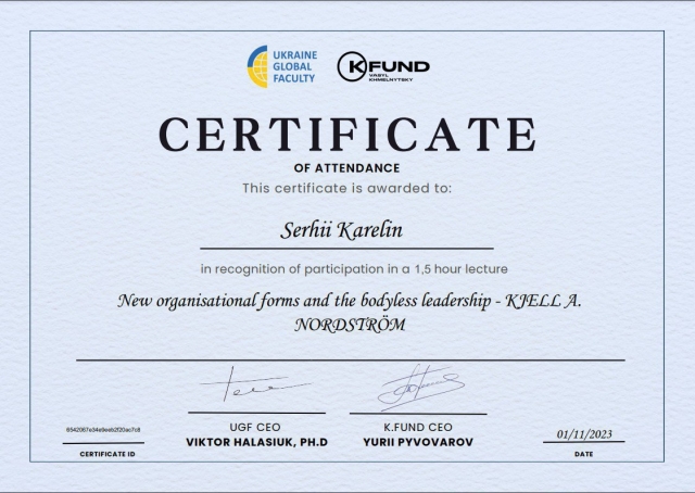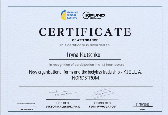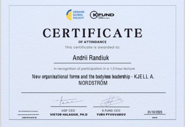 Ідея безперервної освіти безумовно є сучасним трендом. Викладачі кафедри економіки НУБіП України, на чолі із завідувачем Вікторією Байдалою та гарантом освітньої програми «Економіка підприємства» ОС «Магістр» Тетяною Гуцул, підтримуючи підготовку компетентного фахівця, конкурентоспроможного на ринку праці, здатного до ефективної роботи на рівні світових стандартів, соціально відповідального за результати своєї професійної діяльності, вважають, що наразі важливим є підготовка такого студента, який був би готовий до постійного професійного росту й самовдосконалення, в тому числі й засобами неформальної освіти. Неформальна освіта ґрунтується на трьох засадах: «вчитися в дії» – отримувати знання під час практичних завдань; «вчитися взаємодіяти» – часто вона передбачає роботу в групах або командах; «вчитися, вчитися» – аналізувати власний досвід і з нього формувати нові знання. Найбільш прийнятною в умовах сьогодення є освітня формула: формальна + неформальна освіта, щоб досвід, отриманий внаслідок саморозвитку доповнював той, який студенти здобувають у навчальному закладі. Рішенням вченої ради НУБіП України 27 квітня 2022 р. було затверджено порядок визнання результатів навчання здобувачів вищої освіти, здобутих ними шляхом неформальної та/або інформальної освіти (https://nubip.edu.ua/node/125727) Так, неформальна освіта – це освіта, яка здобувається, як правило, за освітніми програмами та не передбачає присудження визнаних державою освітніх кваліфікацій за рівнями освіти, але може завершуватися присвоєнням професійних та/або присудженням часткових освітніх кваліфікацій (Закон України «Про освіту»). Неформальна освіта – це можливості для саморозвитку, самореалізації; для здобуття нових знань і практичного досвіду; для пошуку мотивації та натхнення. А якщо можливості є, їх треба використовувати. У жовтні 2023 р. магістранти спеціальності 051 «Економіка» ОП Економіка підприємства в рамках неформальної освіти долучилися до онлайн-лекції «New organizational forms and the bodyless leadership», яку проводив всесвітньовідомий шведський економіст та спікер Kjell Nordstrom. Учасники мали можливість познайомитися із новими ключовими факторами успіху нової ери, в якій ми живемо, а також з новими організаційними формами лідерства. Дослухатися до порад фахівця щодо моделі того, як кожен з нас може визначити можливості, розвинути свої лідерські навички та скористатися перевагами сучасного безпрецедентного імпульсу для трансформації. Магістранти мали можливість поставити запитання спікеру в чаті англійською мовою, зайшовши на сторінку лекції через власний кабінет. Лекцію можна було слухати в оригіналі (англійською мовою) або з синхронним перекладом на українську мову, обравши канал трансляції самостійно на платформі Ukraine Global Faculty.