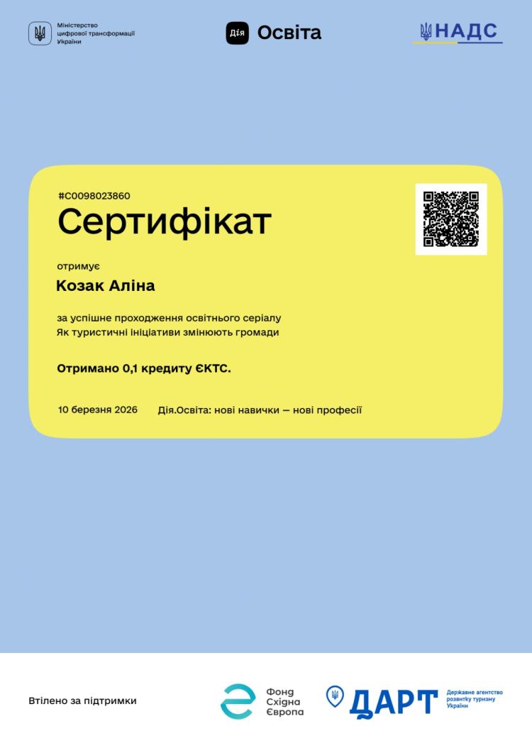Кафедра готельно-ресторанної справи та туризму підтримує ініціативність здобувачів щодо участі у програмах неформальної освіти, що сприяє формуванню конкурентоспроможних фахівців, здатних ефективно працювати в умовах сучасних викликів та динамічного розвитку туристичної індустрії.