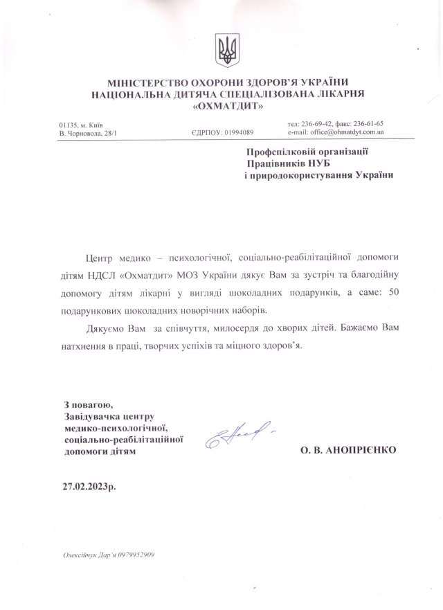 27 лютого 2023 року викладачі кафедри соціальної роботи та реабілітації гуманітарно-педагогічного факультету Національного університету біоресурсів і природокористування України на чолі з завідувачкою кафедри Іриною Віталіївною Сопівник із солодкими подарунками відвідали Центр медико-психологічної, соціально-реабілітаційної допомоги «ОХМАТДИТ».