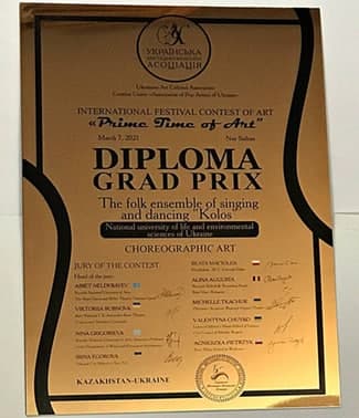 А хореографічна група «Колоса» презентувала наш університет на Міжнародному фестивалі-конкурсі мистецтв «PRIME TIME OF ART» (м. Нур-Султан, Республіка Казахстан). Результат також якнайкращий – ГРАН-ПРІ – головний кубок Міжнародного фестивалю-конкурсу мистецтв «Prime time of art», подяка від організаторів керівнику (Сауріній Ользі Іванівні), сертифікат на безкоштовну участь у наступних фестивалях-конкурсах.