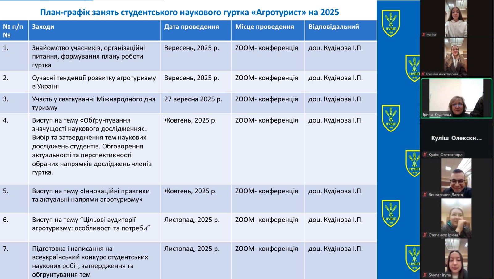 2 вересня 2025 року відбулося перше організаційне засідання студентського наукового гуртка «Агротурист». До участі долучилися активні студенти 3-го та 4-го курсів освітніх ступенів «бакалавр» і «магістр» спеціальностей «Туризм та рекреація» і «Готельно-ресторанна справа та кейтеринг».