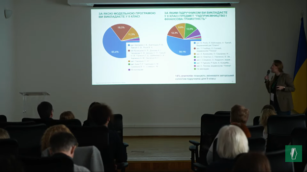 У рамках роботи секції №2 «Освітній контент нового покоління» було презентовано результати дослідження досвіду викладання предмета «Підприємництво і фінансова грамотність» вчителями, яку презентувала Вікторія РОЛІК, керівниця Центру фінансових знань «Талан» НБУ.