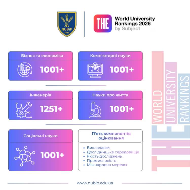 НУБіП України 21 січня 2026 року отримав оновлені результати у престижному рейтингу Times Higher Education World University Rankings by Subject 2026, зберігши позиції у п’яти предметних напрямах: Business and Economics, Computer Science, Engineering, Life Sciences та Social Sciences. Оприлюднені показники засвідчують сталість присутності університету в глобальному академічному просторі та послідовний рух до поглиблення європейської інтеграції в галузі освіти і науки.