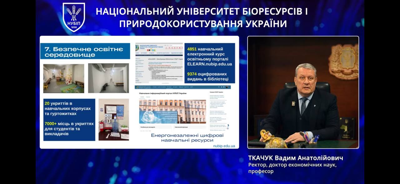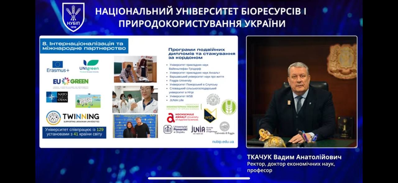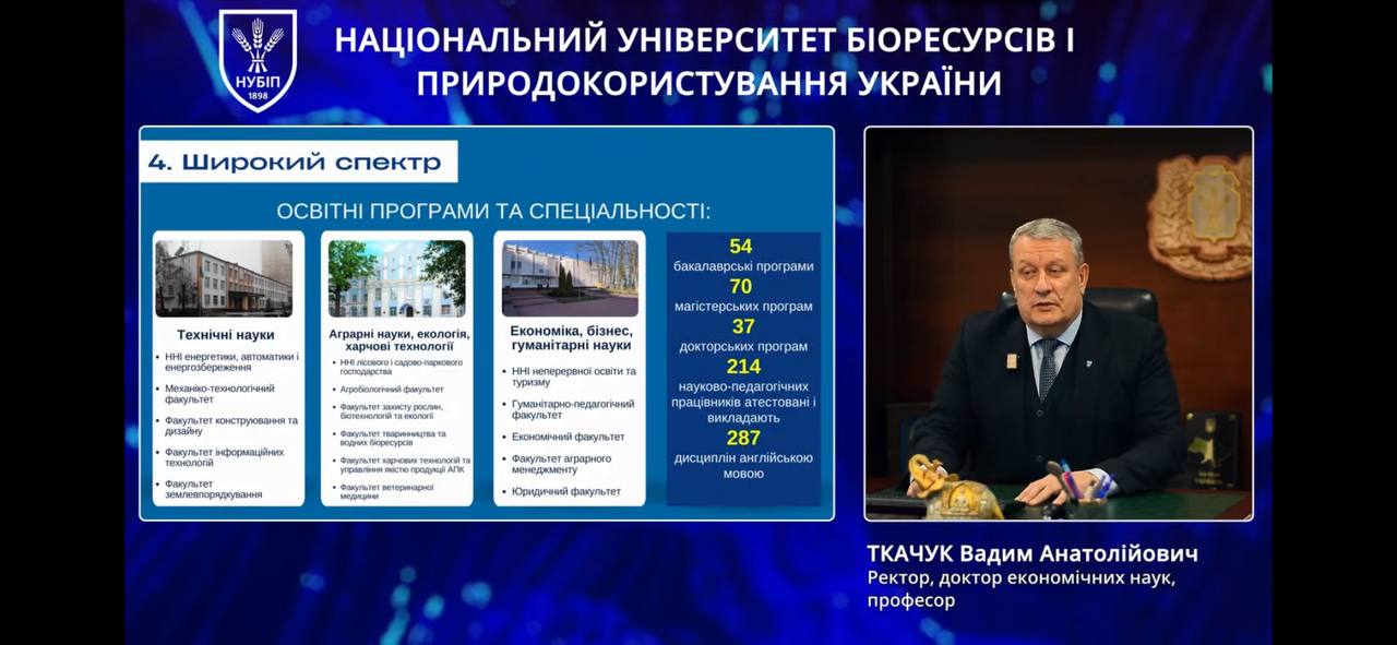 Відкрив загальну частину заходу ректор НУБіП України Вадим ТКАЧУК. У своєму виступі він акцентував увагу на стратегічних перевагах університету, детально зупинившись на 10 унікальних можливостях, які університет відкриває перед сучасним студентом. Серед них: