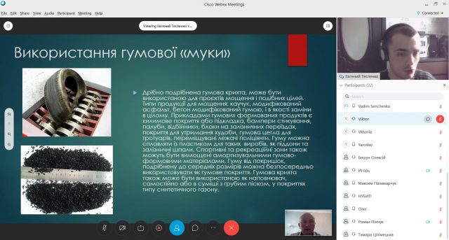 Активну участь у відеоконференції взяли магістри першого року навчання спеціальності «Транспортні технології на автомобільному транспорті» НУБіП України. 12 студентів-магістрів підготували доповіді. Активно задавали питання та брали участь в живих дискусіях із учасниками конференції. Найбільш цікавими були доповіді Сенченка Максима про ефективність рециклінгу при переробці автомобілів, Тесленка Євгенія про сучасні технології переробки шин, Цілімецької Тамари, яка описала роль логістики в транспортній галузі, Паламарчука Максима, доповідь якого була зорієнтована на транспортно-логістичний менеджмент й інших учасників.