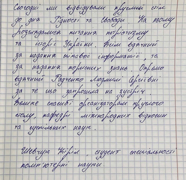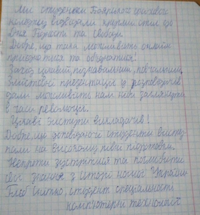 Викладачі історії Боярського фахового коледжу НУБІП України – Радченко Л.С., Прончук О.В., Роздорожний П.А. разом із студентами перших та других курсів відвідали проведенні заходи. Здобувачі освіти залишились під враженням, написали низку відгуків про круглий стіл, який пройшов цікаво, зворушливо.