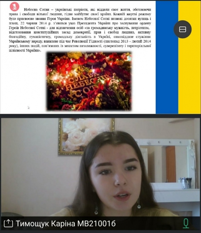 2. «Україна – країна нескорених» - онлайн-трансляція до Дня Гідності та Свободи. Спікерами заходу були: Станіслав Ніколаєнко – ректор НУБІП України, доктор педагогічних наук, професор, академік Національної академії педагогічних наук України; Микола Томенко – голова Наглядової ради НУБІП України, доктор політичних наук, професор; Василь Стрілець – в.о. завідувача кафедри міжнародних відносин та суспільних наук НУБІП України, доктор історичних наук, професор; Людмила Протосавіцька – доцент кафедри теорії та історії держави і права НУБІП України, кандидат історичних наук.