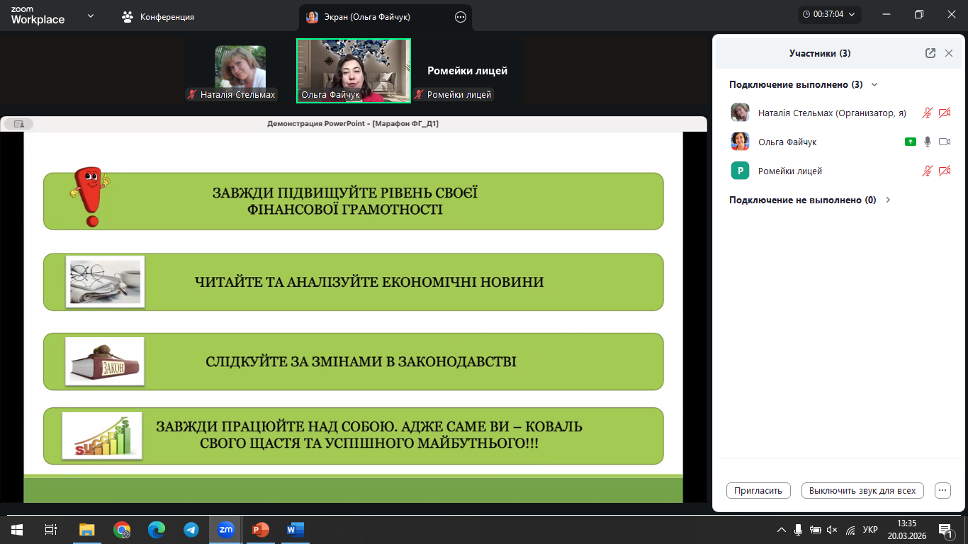 Кандидат економічних наук, доцент Ольга ФАЙЧУК представила лекцію, присвячену фінансовій грамотності, під час якої було висвітлено ключові аспекти ефективного управління особистими фінансами. Особливу увагу зосереджено на формуванні фінансового мислення, умінні приймати зважені рішення, планувати бюджет та уникати типових фінансових помилок. У сучасних умовах невизначеності фінансова обізнаність стає не просто корисною навичкою, а необхідною складовою життєвого успіху.