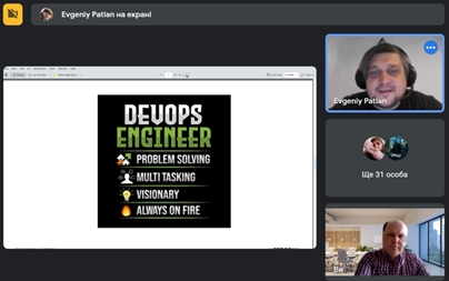 Євгеній Патлань звернув увагу на обов’язки DevOps-інженера, які варіюються залежно від проєкту, але зазвичай до основних функцій DevOps-інженера входять створення та налаштування інфраструктури: автоматизація та покращення процесів розробки ПЗ та релізів; робота з девелоперами, щоб упевнитися, що код відповідає необхідним характеристикам; забезпечення безпеки та захисту комп’ютерних систем (інфраструктури).