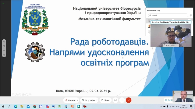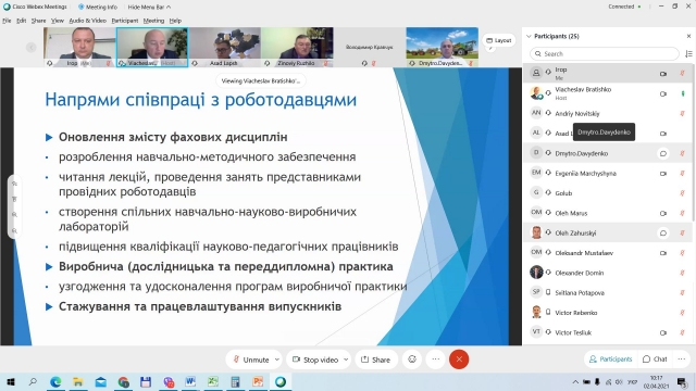 Для обговорення освітніх програм підготовки інженерних здобувачів першого та другого рівнів освіти, з точки зору виробництва, 2 квітня 2021 року відбулося засідання ради роботодавців механіко-технологічного факультету і факультету конструювання та дизайну, за участю гарантів освітніх програм та завідувачів кафедр відповідних факультетів. Захід проводився в дистанційному форматі, з використанням платформи Cisco Webex Meetings. Зі сторони ради роботодавців, у засіданні взяли участь: голова ради, генеральний директор ТОВ «КУН-Україна», Асад Лапш, директор УкрНДІТВП ім. Л.Погорілого, д.т.н., професор, академік НААН України, Володимир Кравчук, генеральний директор дочірнього підприємства «АМАЗОНЕ УКРАЇНА», Дмитро Давиденко, територіальний менеджер ТОВ «Джон Дір Україна», Олександр Мустафаєв, менеджерка з персоналу ТОВ «Джон Дір Україна», Яна Медушовська, представник компанії «NEW HOLAND», Станіслав Сторожук.