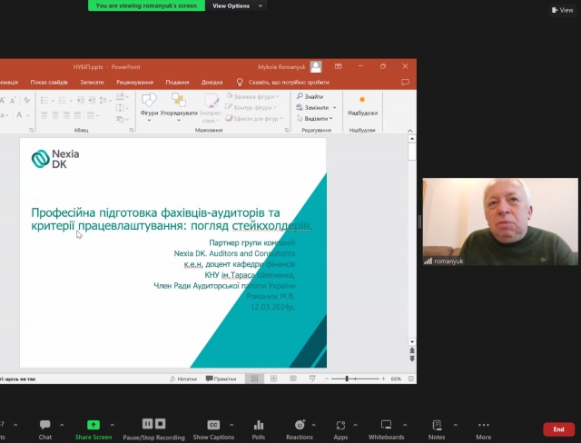 В доповіді «Професійна підготовка фахівців-аудиторів та критерії працевлаштування: погляд стейкхолдерів», партнер з контролю якості Групи компаній «Nexia DK» Микола Романюк звернув увагу на постійну співпрацю з кафедрою обліку та оподаткування щодо постійних обговорень ОП, залучення здобувачів до проходження практик, на яких вони демонстрували достатньо високий рівень фахової підготовки; наголосив на сучасних проблемах в аудиті (кадрові питання, серед яких – конкуренція за кадри з іншими галузями; методологія аудиту, нормативна база); визначив основні підходи до розвитку та підготовки кадрів для аудиторських компаній та їх зацікавленості і вмотивованості безпосередньо на робочих місцях: професійне навчання персоналу, інформування персоналу, підтримка персоналу.