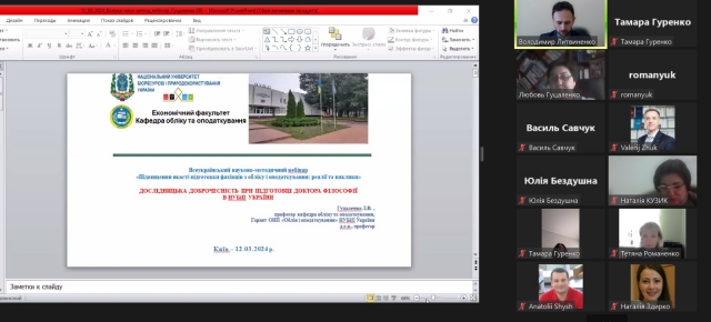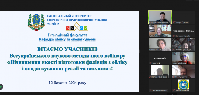 12 березня 2024 року кафедрою обліку та оподаткування економічногофакультету організовано та проведено Всеукраїнський науково-методичний вебінар «Підвищення якості підготовки фахівців з обліку і оподаткування: реалії та виклики», на якому обговорювалися питання забезпечення якості вищої освіти як пріоритетної домінанти діяльності кафедри обліку та оподаткування НУБіП України.