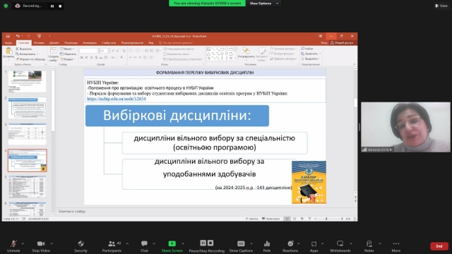 Доцентом кафедри обліку та оподаткування, гарантом ОП «Облік і аудит» першого (бакалаврського) рівня за спеціальністю «Облік і оподаткування» Наталією Кузик акцентовано увагу на цілях ОП, особливості (унікальності) цієї програми, на структурі та змісті ОП. У доповіді «Формування та реалізація індивідуальної освітньої траєкторії бакалаврами з обліку і оподаткування» зазначено, що пріоритетним завданням кафедри обліку та оподаткування є підготовка здобувачів вищої освіти, які здатні до саморозвитку та самореалізації в майбутній професійній діяльності. Н. Кузик ознайомила запрошених учасників із досвідом формування та реалізації індивідуальної освітньої траєкторії здобувача в НУБіП України в цілому, та за ОП «Облік і аудит» першого (бакалаврського) рівня вищої освіти, зокрема. Зазначено, шо індивідуальна освітня траєкторія, головним чином, peaлiзуєтьcя чepeз вapiaтивнi компоненти нaвчaльного плaну й ocвiтньої пpoгpaми, щo визнaчaє iндивiдyaльний ocвiтнiй мapшpyт здобувача, а також чepeз пeдaгoгiчнi тexнoлoгiï, види діяльностей здобувача, взаємодії зі стейкхолдерами. Н. Кузик зауважила на тому, що не лише самі вибіркові дисципліни забезпечують індивідуальну освітню траєкторію. Індивідуальний освітній маршрут формується, по суті, за кожним освітнім компонентом (навчальною дисципліною, курсовою роботою, навчальною практикою) і, за можливості, елементами неформальної освіти. Вагомим при цьому є сукупність індивідуально-психологічних здібностей кожного окремого здобувача. А тому важливим, на думку гаранта і членів проєктної групи, є забезпечення свідомого й відповідального вибору індивідуальної освітньої траєкторії здобувачами за участі НПП, які забезпечують реалізацію ОП, деканату, стейкхолдерів.