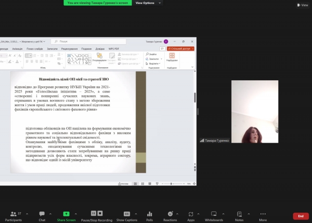 Тамарою Гуренко, доцентом кафедри обліку та оподаткування НУБіП України, гарантом ОПП «Облік і аудит» другого (магістерського) рівня вищої освіти за спеціальністю «Облік і оподаткування» проведений науковий аналіз практичного стану підготовки бухгалтерів, висвітлені підходи до формування професійної компетентності майбутніх спеціалістів та доведений вдосконалений зміст і структура освітньо-професійної програми підготовки магістрів обліку і оподаткування відповідно до потреб та тенденцій ринку праці. Т. Гуренко відповідно до Програми розвитку НУБіП України на 2021-2025 роки «Голосіївська ініціатива – 2025», визначена відповідність ОП місії і стратегії Університету, а саме «створенні і поширенні сучасних наукових знань, отриманих в умовах воєнного стану з метою збереження життя і умов праці людей, продовження якісної підготовки фахівців європейського і світового фахового рівня». Зазначила, що підготовка обліковців на ОП націлена на формування економічно грамотного та соціально відповідального фахівця з високим рівнем наукової та інтелектуальної свідомості; опанування майбутніми фахівцями з обліку, аналізу, аудиту, контролю, оподаткування сучасними технологіями та методиками дозволяють стати затребуваними на ринку праці підприємств усіх форм власності, зокрема, аграрного сектору, що відповідає одній із місій університету. Гарант зазначила, що «теоретичне обґрунтування умов формування професійної компетентності майбутніх бухгалтерів полягає у забезпеченні моделювання процесу професійної підготовки майбутніх фахівців на компетентнісній основі, мотивування майбутніх бухгалтерів до оволодіння професією на адаптивних засадах, створення інформаційного освітнього середовища з формування професійної компетентності майбутніх бухгалтерів на основі інформаційно-бібліотечного та інформаційно-комунікаційного забезпечення, динамічна орієнтація варіативної системи змісту професійної підготовки бухгалтерів до вимог роботодавців».