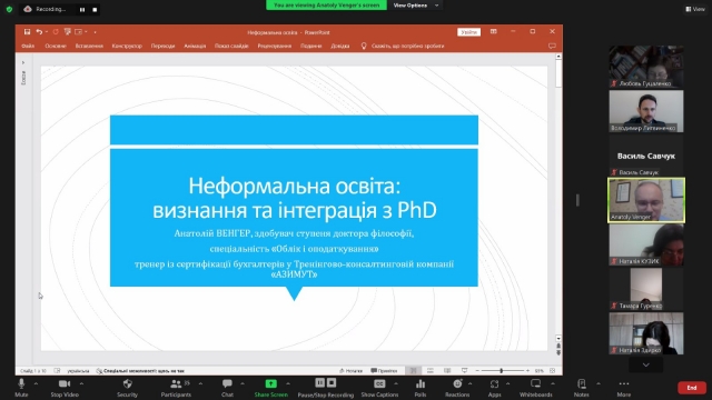 До дискусії доєднався Анатолій Венгер, здобувач третього (освітньо-наукового) рівня вищої освіти спеціальності 071- Облік і оподаткування НУБіП України, висвітлив основні переваги освітньої та наукової складової при підготовці доктора філософії спеціальності 071-Облік і оподаткування, розкрив алгоритм визнання результатів навчання, здобутого шляхом неформальної освіти закладами вищої освіти.
