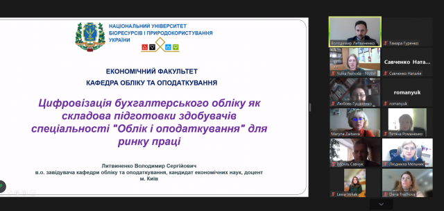 У роботі Всеукраїнського науково-методичного вебінару взяли участь науковці НУБіП України, Київського національного економічного університету імені Вадима Гетьмана, Державного університету «Житомирська політехніка», Київського національного університету імені Тараса Шевченка, Харківського національного економічного університету імені С. Кузнеця, Поліського національного університету, Уманського національного університету садівництва, Західноукраїнського національного університету, Миколаївського національного аграрного університету, Вінницького національного аграрного аграрного університету. У дискусії активну участь прийняли роботодавці, зокрема: Валерій Жук – голова ради Федерації аудиторів, бухгалтерів і фінансистів АПК України, Олег Канцуров – виконавчий директор Інспекції із забезпечення якості Органу суспільного нагляду за аудиторською діяльністю, Юлія Бездушна – директор Товариства з обмеженою відповідальністю «Всеукраїнський інститут права і оцінки», Микола Романюк – партнер з контролю якості Групи компаній «Nexia DK», Сергій Панарін – заступник директора департаменту – начальник відділу інспектування в аграрній галузі, екології та природокористування Департаменту контролю в аграрній галузі, екології та природокористування Держаудитслужби України, Марина Зайцева – координатор освітніх програм в офіційному представництві СІМА в Україні, Тетяна Чорна – головний бухгалтер Філії «Птахофабрика «Авіс» Приватного акціонерного товариства «Агрохолдинг Авангард», Наталія Гаєвська – директор з контролю якості ТОВ «ПКФ Україна», Віктор Колесник – директор Товариства з обмеженою відповідальністю «Розмай Агро». Серед учасників заходу – аспіранти, здобувачі першого (бакалаврського) та другого (магістерського) рівнів вищої освіти спеціальності «Облік і оподаткування».