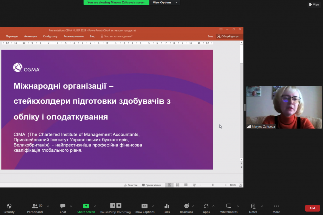 З доповіддю «Міжнародні організації – стейкхолдери підготовки здобувачів з обліку і оподаткування» виступила Марина Зайцева – координатор освітніх програм в офіційному представництві СІМА в Україні, яка звернула увагу, що у 2024 р. до СІМА входить понад 760 000 членів та студентів, 250 000 компаній та роботодавців, 34 представництва у всьому світі, 45 міжнародно визнаних дипломів та сертифікатів. Зазначила про плідну співпрацю з НУБіП України; зауважила, що поєднання зусиль роботодавців, інститутів, навчальних закладів, які акредитовані СІМА повинні бути направлені на підвищення кваліфікації як здобувачів, так і викладачів вищих навчальних закладів. Співпраця здійснюється шляхом навчання здобувачів за спеціальними програмами професійної кваліфікації СІМА, проведенням міжнародних студентських конкурсів CGMAEmergingLeaders, онлайн бізнес-ігри, де за 2020 – 2023 рр. НУБіП України знаходиться в трійці лідерів, конкурсів викладачів СІМА ExcellenceAward (у конкурсі приймала участь і дійшла до фіналу д.е.н., професор кафедри обліку та оподаткування Гуцаленко Л.В.), грантів для дослідників, онлайн-зустрічі з академічними партнерами Friday`sFacultyHour.