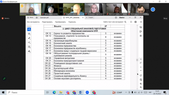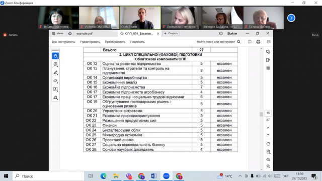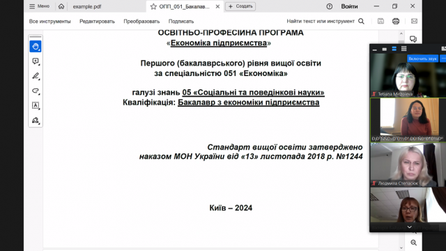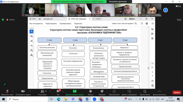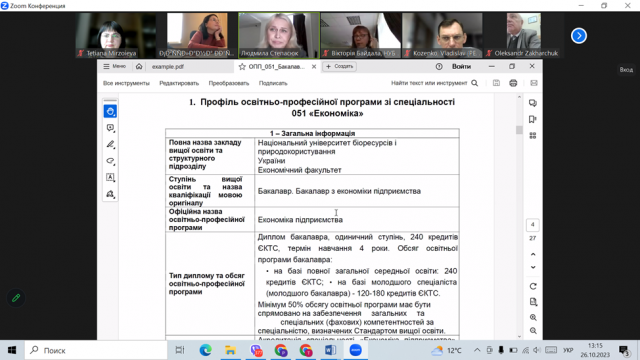 Так, наприкінці жовтня 2023 р. згідно затвердженого плану роботи в онлайн-форматі відбулося засідання робочої групи з обговорення освітньої програми першого (бакалаврського) рівня вищої освіти за спеціальністю 051 «Економіка». Його учасниками стали члени робочої групи і стейкхолдери – представники бізнесу, наукових установ і здобувачі вищої освіти.