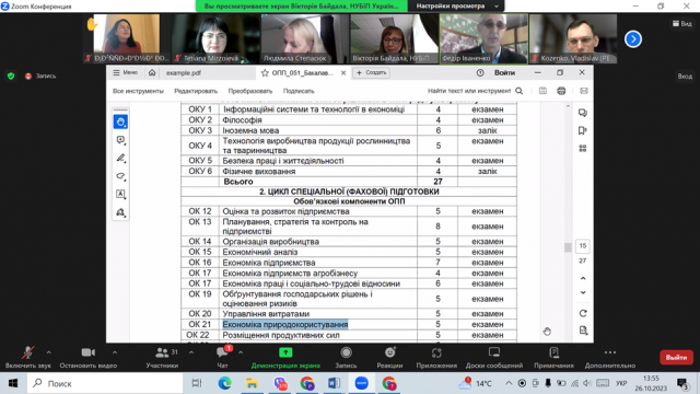 На початку засідання гарант освітньої програми к.е.н., доцент Людмила Степасюк, представляючи програму, акцентувала увагу на її унікальності та зазначила, що вона базується на наявності обов’язкових і вибіркових компонентів, а також практичної підготовки здобувачів вищої освіти. В обговоренні програми взяли активну участь представники робочої групи та стейкхолдерів: Дмитро Шиян (Харківський економічний університет), Вікторія Онегіна (Державний біотехнологічний університет, м. Харків), Олег Тюрін ( ТОВ «Група комерційної медиації), Галина Филюк (Київський національний університет імені Тараса Шевченка), Федір Іваненко (Київський національний економічний університет імені Вадима Гетьмана), Влад Козенко ( ТОВ «Сандора»), Павлишинець Наталія, Росул Ярослава (ВСП «Мукачівський фаховий коледж НУБіП України»).