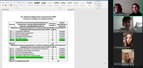 Обговорення відбувалося за участю гаранта ОПП - Ольги ГОГУЛІ, кандидата економічних наук, доцента кафедри менеджменту ім. проф. Й. С. Завадського, а також членів проєктної групи: Тетяни БАЛАНОВСЬКОЇ, кандидата економічних наук, професора, завідувача кафедри; Оксани ГАВРИШ та Кристини ДРАМАРЕЦЬКОЇ, кандидатів економічних наук, доцентів кафедри менеджменту ім. проф. Й. С. Завадського, а також здобувача другого (магістерського) рівня вищої освіти Вікторії СІДЕНКО.